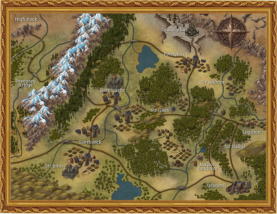 The map of the kingdom, showing the main castles, villages, and natural landmarks.